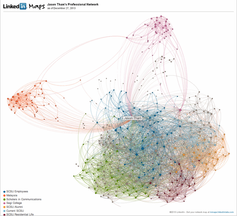 As I become more interested to learn about how my connections with people looks like, I used a LinkedIn built-in app to visualize such connections. This allows me to think of ways to explain to students what a PLN is/looks like, and things they should consider: