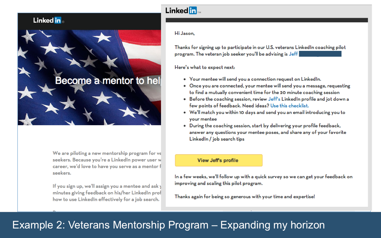 Another example took place just this past summer, when I signed up for the veterans mentorship program offered through LinkedIn. At that time, LinkedIn piloted a program that aimed to help veterans to readjust to civilian jobs and they acquired seasoned LinkedIn users to help “coach” these veterans to use LinkedIn as part their transition process. I was fortunate to be paired with a Cyberspace officer from the US AirForce and we had some meaningful exchanges on how to use LinkedIn to get a job (basically). I am happy to say that he’s now employed as an IT Technical Manager in Virginia. This experience has expanded my horizon not only by working with someone old than me, but from a field that I had no experience in. It was rewarding.