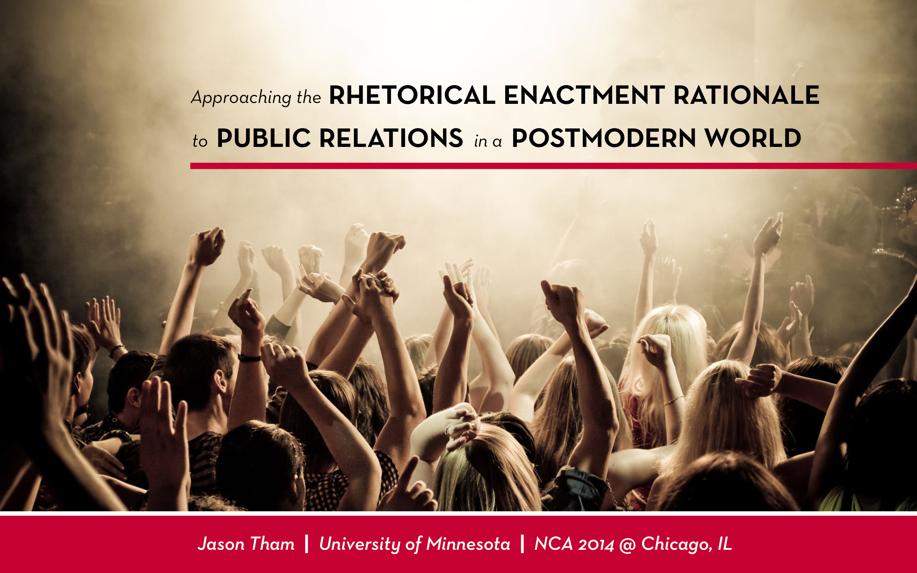 Tham, Jason. “Approaching the Rhetorical Enactment Rationale to Public Relations in a Postmodern World: A Hybrid Model Manifesto.” National Communication Association 100th Annual Convention. Palmer House Hilton Hotel, Chicago, IL. November 23, 2014.