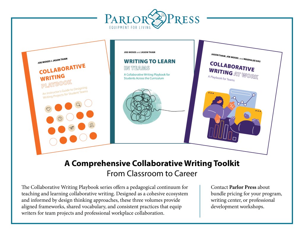I am thrilled to share that the Collaborative Writing Playbook series (published by Parlor Press) is now complete and is being published in the next few weeks! I am making this early announcement in light of the CCCC convention this week––as we make a special bundle offer to teachers and program leaders who are looking to adopt a packaged resource.