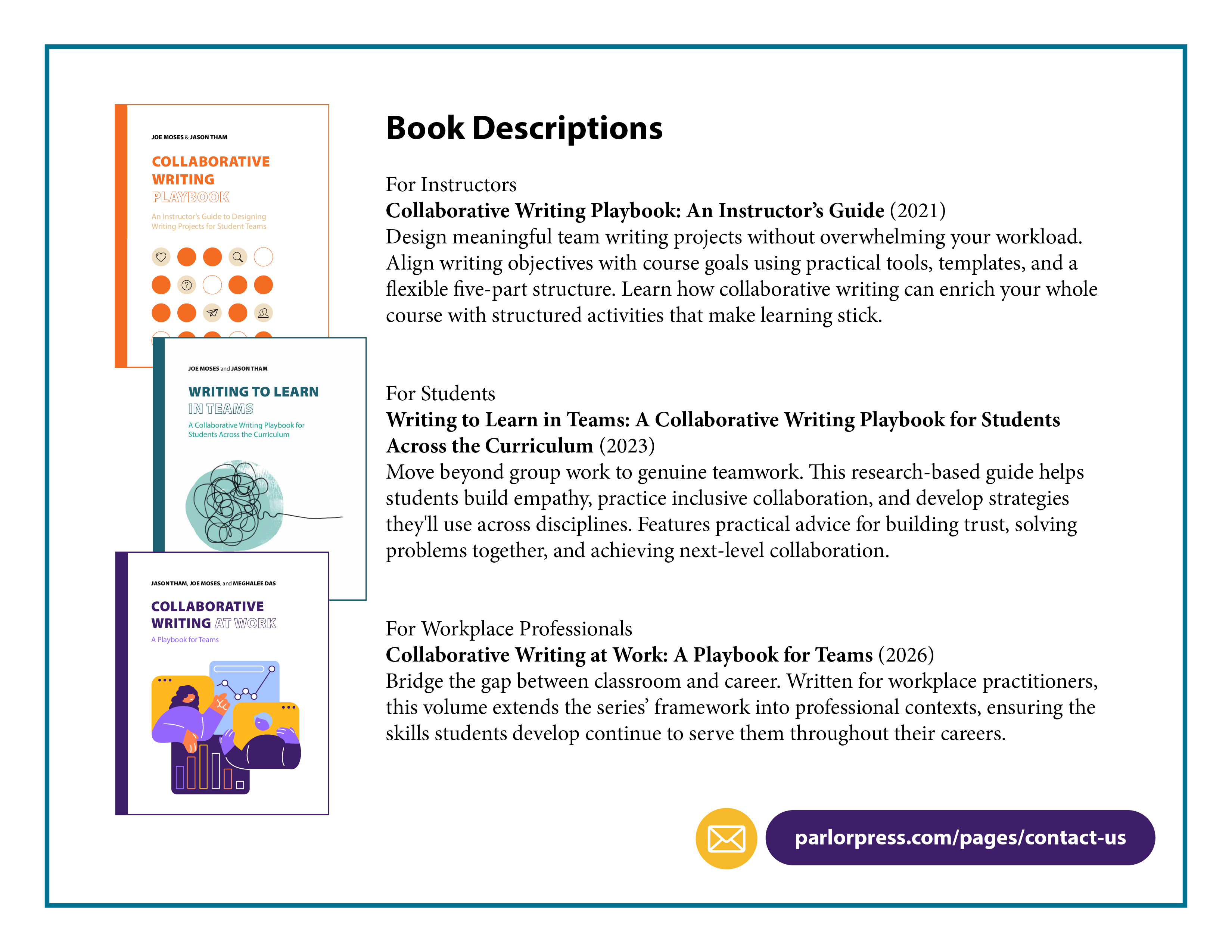 The third and final volume, Collaborative Writing at Work: A Playbook for Teams, co-authored with Joe Moses and Meghalee Das, bridges classroom and career. Written for workplace practitioners and professionals, it extends the series’ shared framework into real-world professional contexts to ensure the collaborative skills writers develop in school don’t stop at graduation.